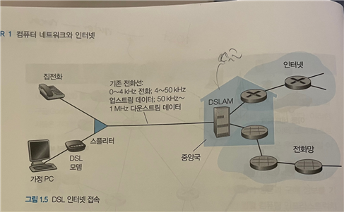 ○ 집 전화에서 발생하는 데이터는 기존 전화선을 통해 CO로 전송된다. 가정 PC에서 발생하는 데이터는 DSL 모뎀 통신 링크 -> 기존 전화선을 통해 CO로 데이터가 전송된다.